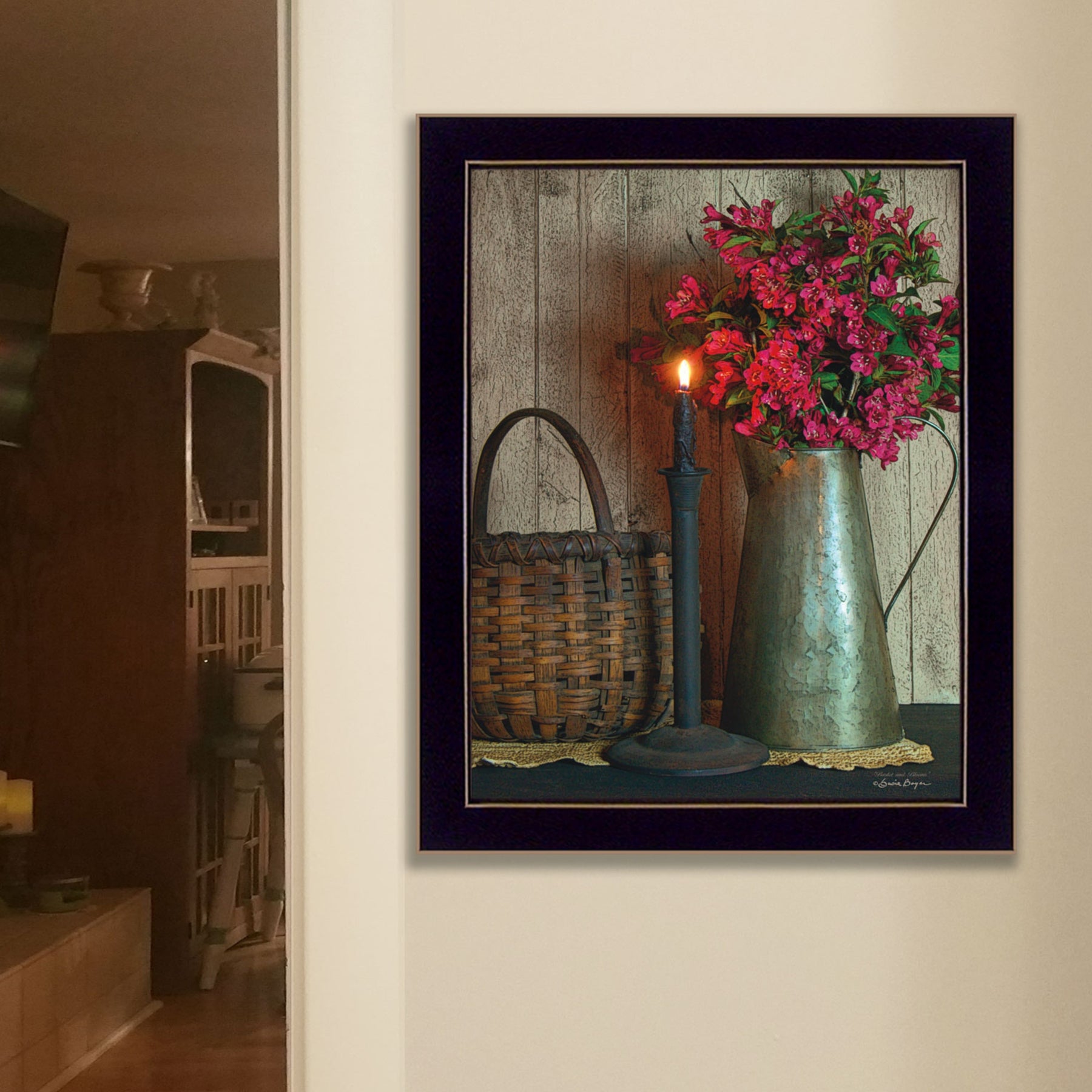 Bring warmth and vintage character to your wall with this framed printed wall art. Featuring a floral still life scene with a metal pitcher, woven basket, and candlelight detail, this 18" x 14" decorative print adds a cozy, classic accent to entryways, hallways, living rooms, and farmhouse-inspired interiors.