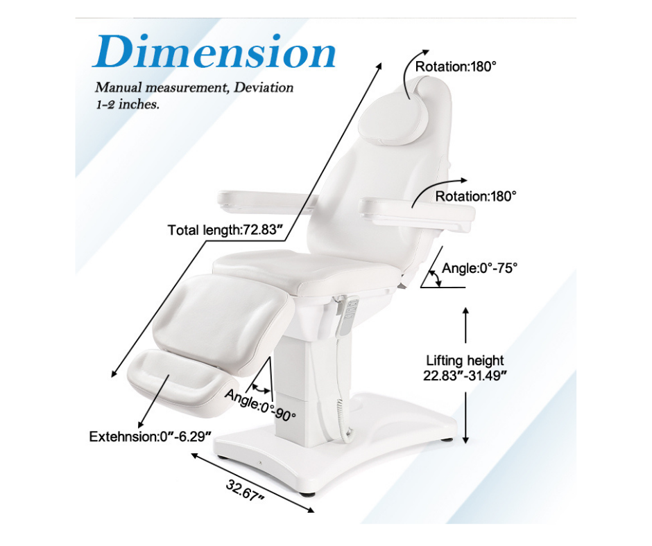 La cama/mesa de masaje y cama de spa facial eléctrica MELVA está diseñada exclusivamente para ser compatible con el uso en múltiples ocasiones, lo que permite la máxima libertad incluso en una clínica de spa. Dispone de 3 motores para controlar la altura de la cama, el ángulo del respaldo y el reposapiernas. Todo el cuerpo está compuesto de cuero fácil de limpiar y espuma de alta densidad y exterior acrílico. Con un mando a distancia tecnológico de mano y un reposacabezas extraíble, es fácil de utilizar según la demanda. La garantía de nuestro equipo es de un año.