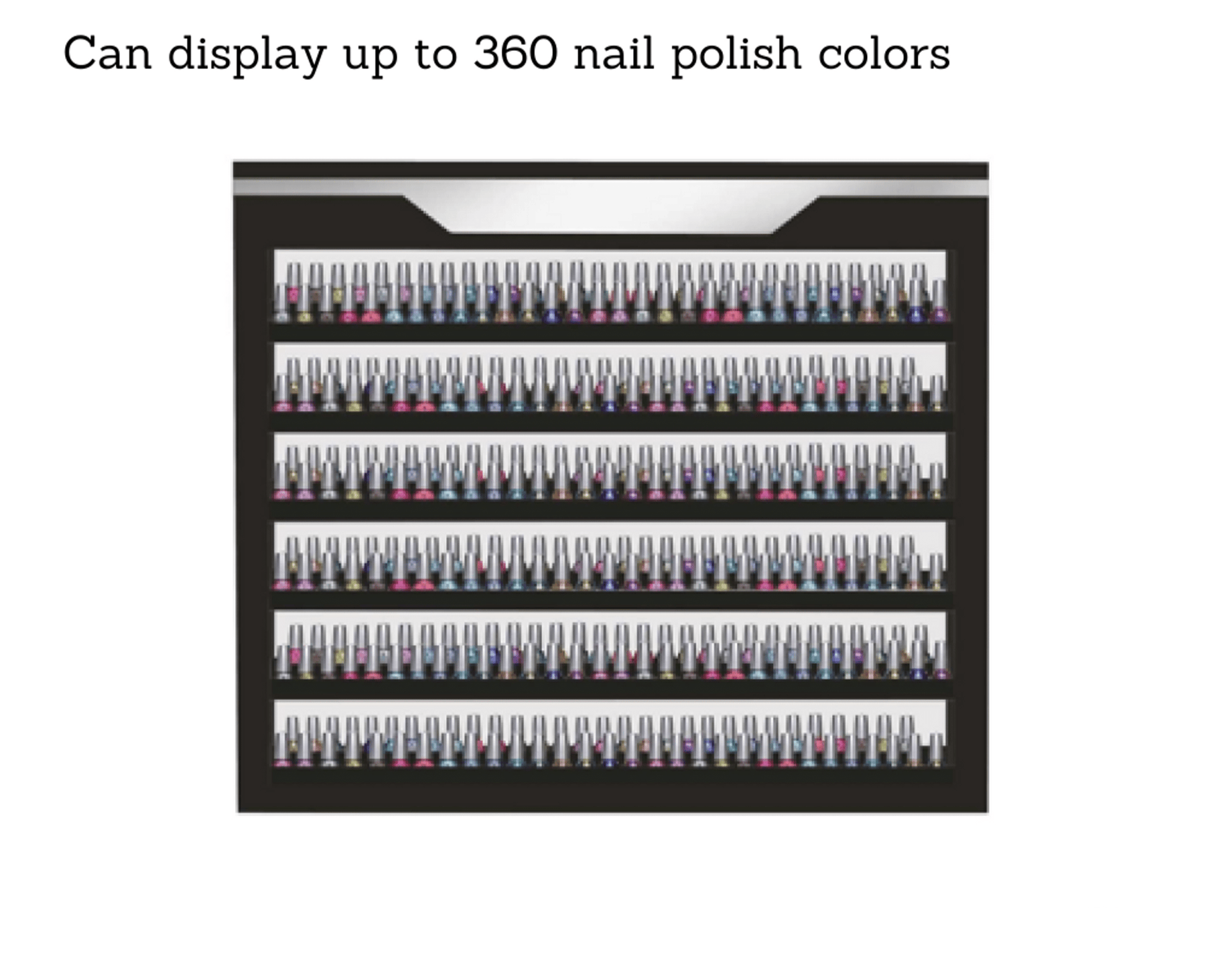 • Bottom Tier 1 1/4" Lip extended from frame to secure polish bottles