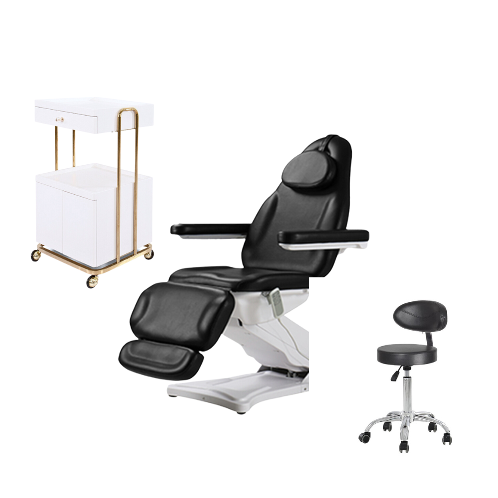 AGLAIA electric lash chair black three piece set is according to the salon market to creat,it is including the lash chair/ facial bed/spa bed/esthetician bed、facial stool/esthetician stool/beauty therapist chair,facial trolley/esthetician hand trolley,all buy in one shop and meet most of salon owner's requirement.