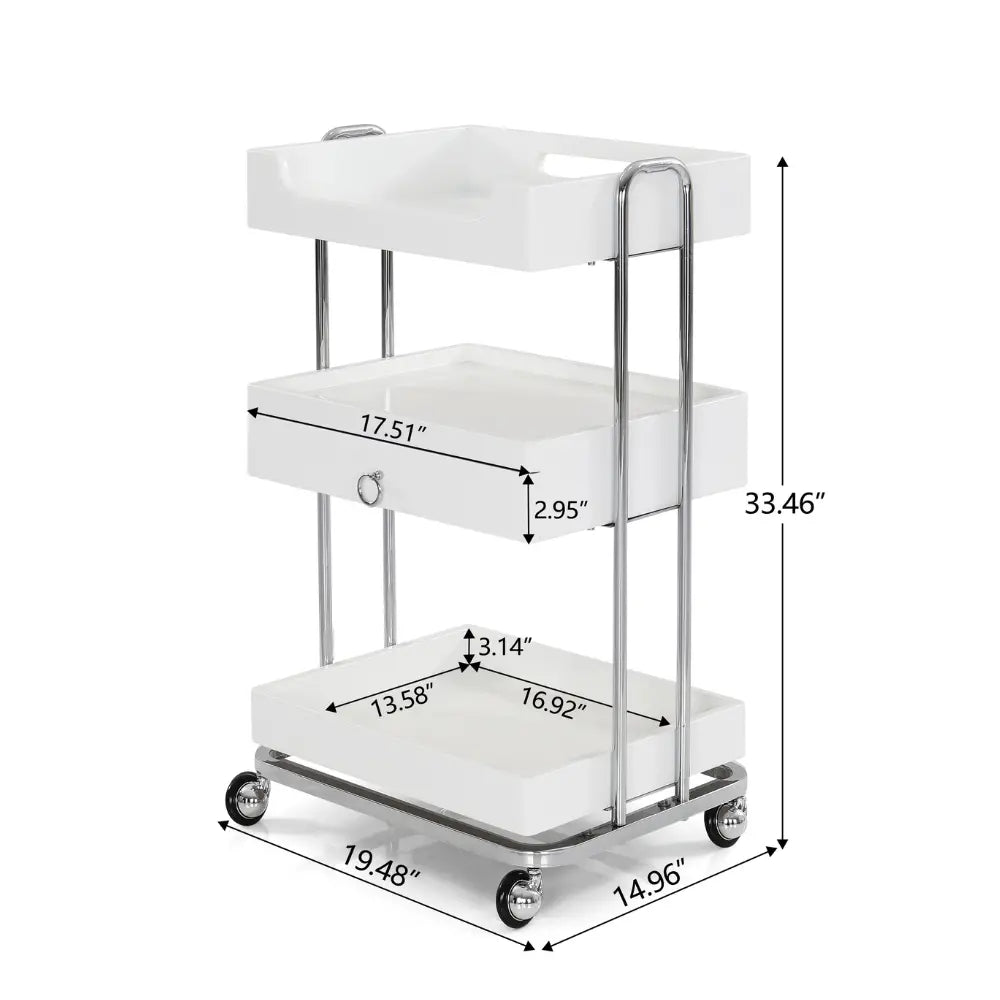 This White Salon Cart Come with One drawer and 2 sheleves,base on the frame metal materials,offer high-quanlity to all the professional esthetician.Four heavy-duty non-stick castors The cart also comes with , allowing you to move it around with ease and flexibilCity.