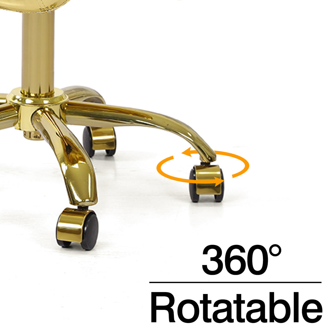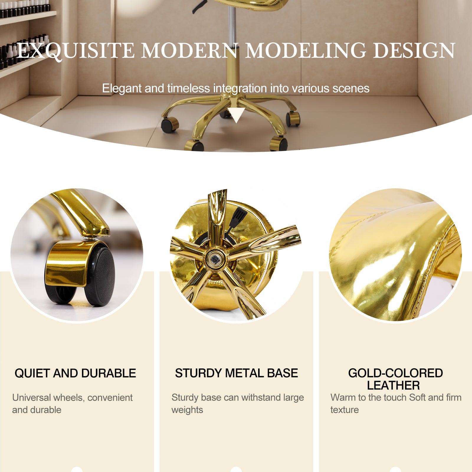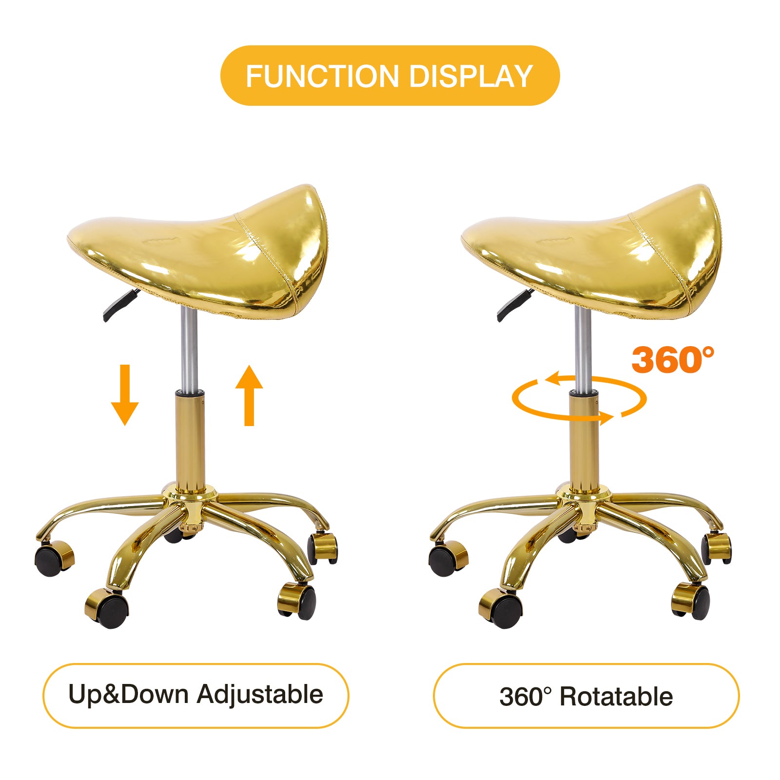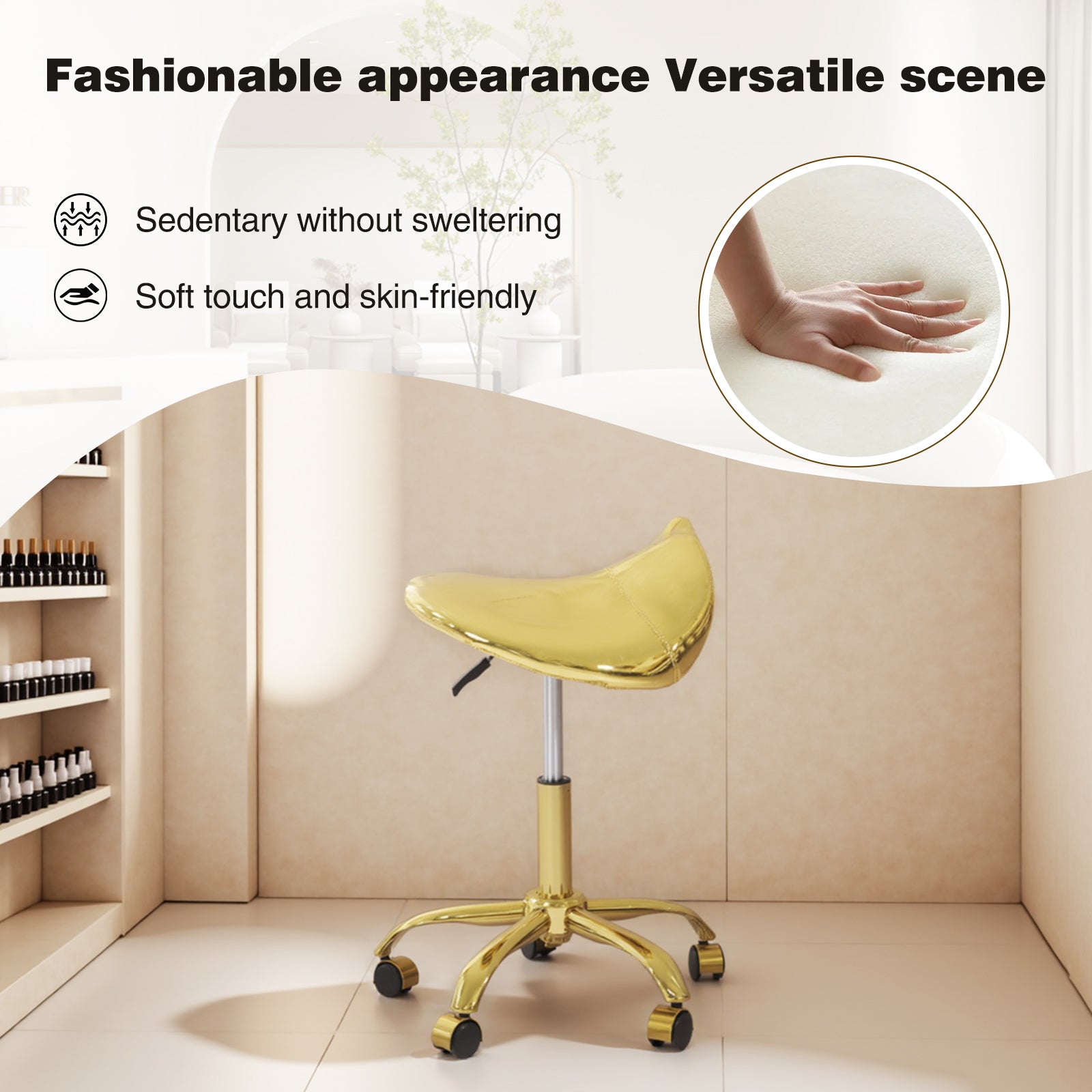 This professional Golden Saddle Seat Chair is perfect for estheticians and pedicurists. The chair features a glossy PU leather material that is easy to clean and maintain. With a compact size of 50*50*25cm and a sleek design.